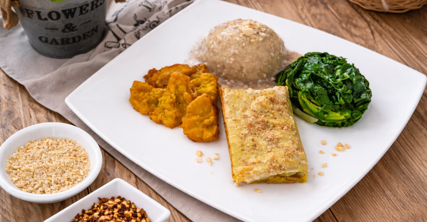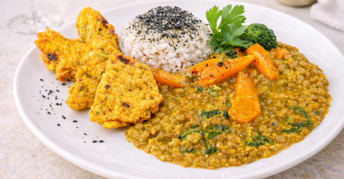 Zapečena slanutkova palačinka nadjevena tofuom i povrćem - Proso u umaku od lješnjaka - Blitva