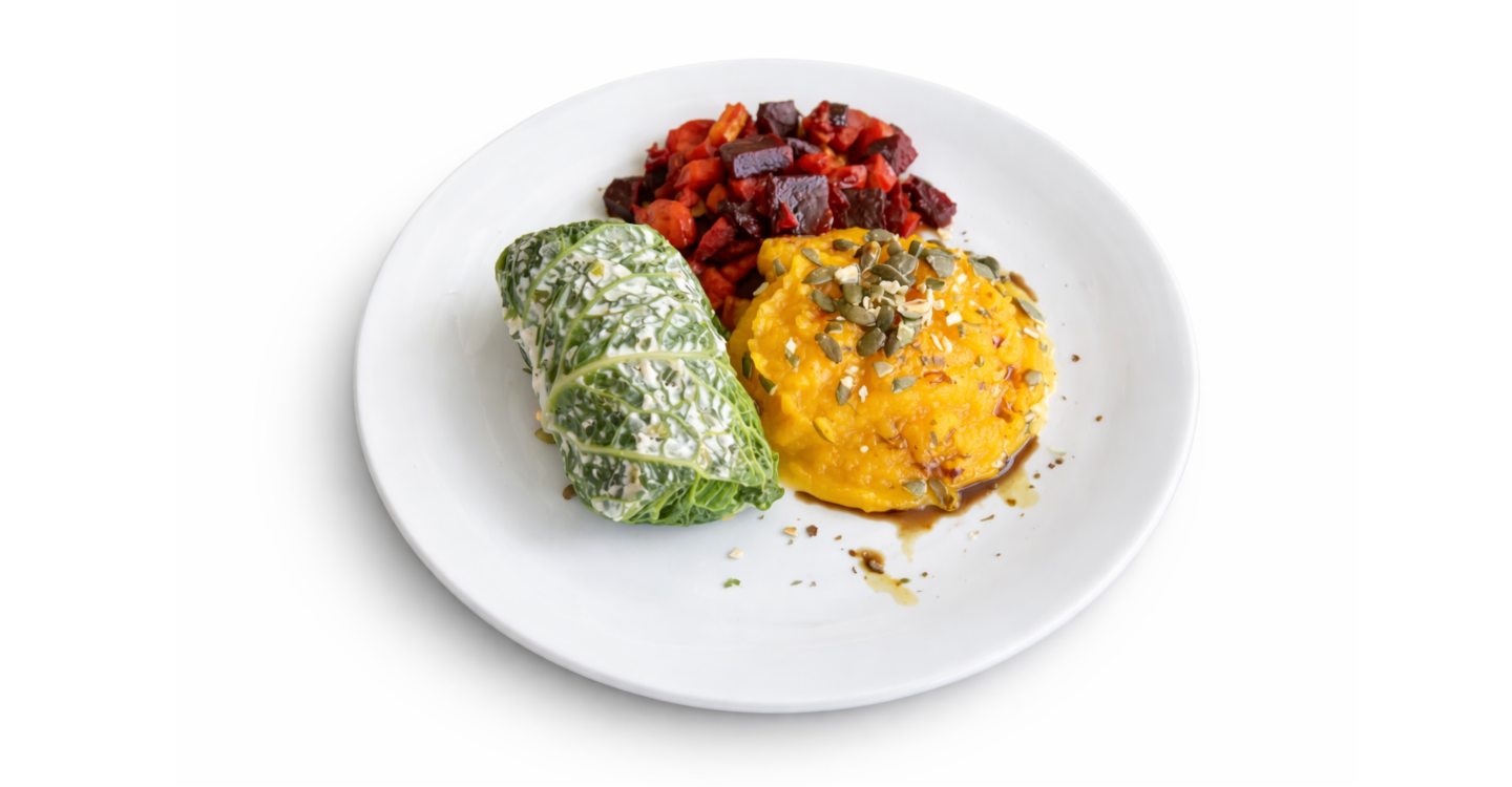 Krem juha od kukuruza - Sarmice od kelja nadjevene smeđom rižom i tempehom - Pire od bundeve i crvene leće - Pareno povrće - Grissini - Miješana salata s klicama