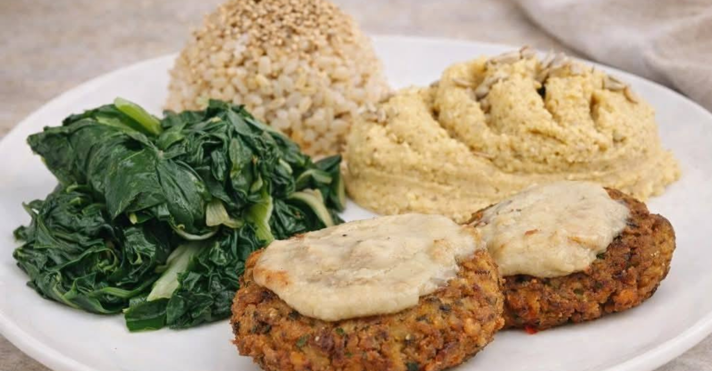 Povrtni popečci s mozarelom od indijskih oraščića - Smeđa riža sa gomashiom - Blitva - Humus