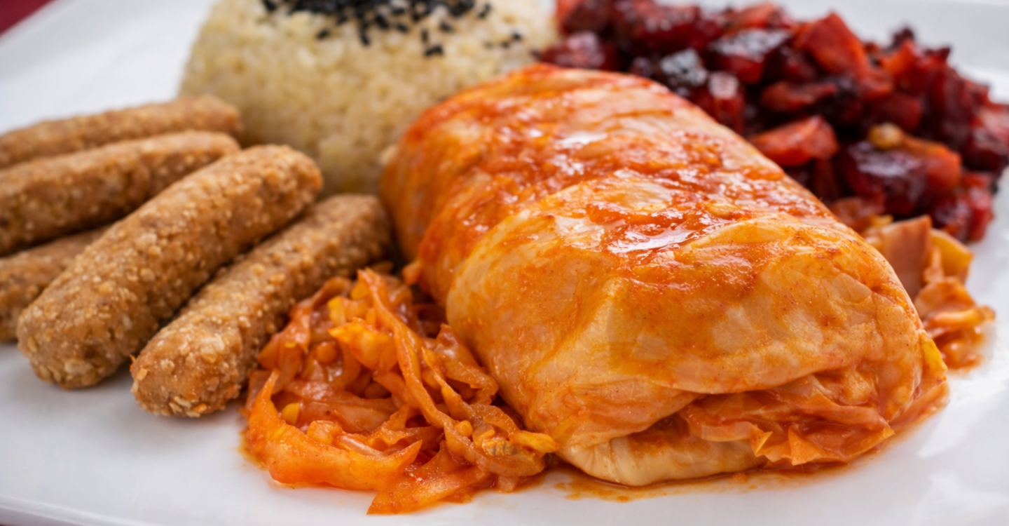 Sarmice od kelja nadjevene smeđom rižom i tempehom - Pire od bundeve i crvene leće - Pareno povrće - Grissini